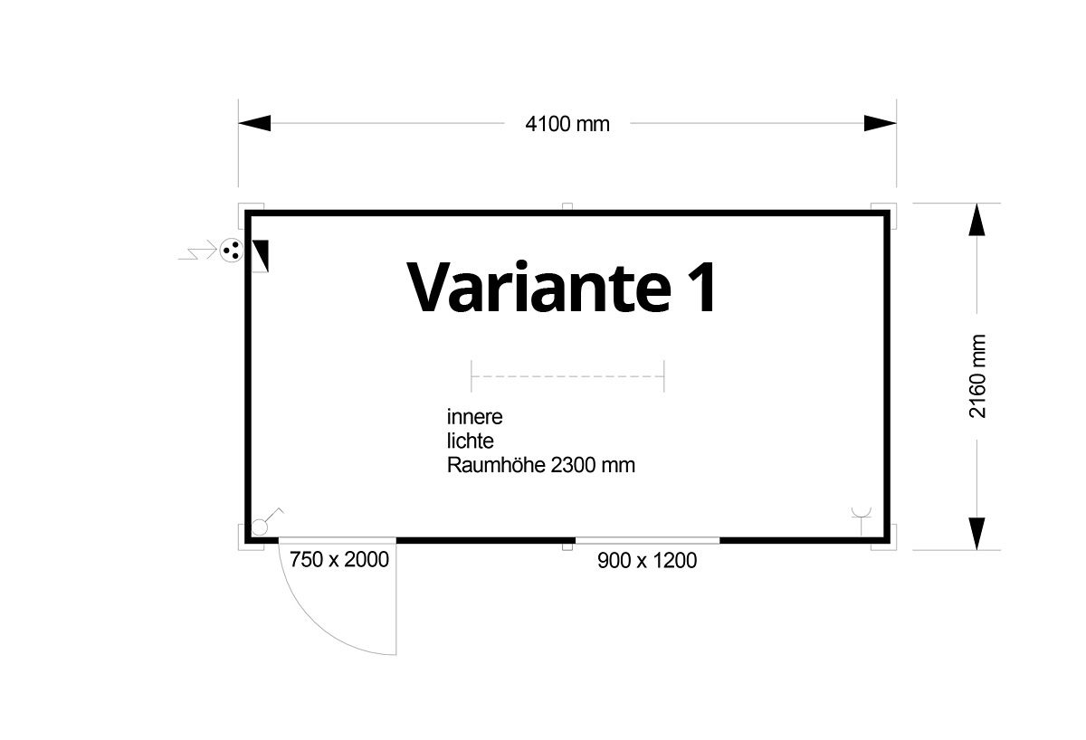 E-Installation mit 1 LED-Leuchte 20 W, 1 Lichtschalter, 1 x Steckdose, SI-Element, CEE-Außenstecker, 3-polig, 16 A 1 x Steckdose für bauseitigen E-Wandkonvektor (bis 3 KW)
