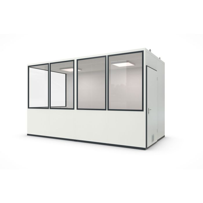 Dieses Hallenbüro / Meisterbüro eignet sich optimal als Einstiegsmodell für Unternehmen, die zusätzliche Aufenthaltsräume oder Hallenbüros im Innenbereich schaffen möchten. Dank seiner standardisierten Bauweise und reduzierten Gestaltungsmöglichkeiten ist diese Version kostengünstig und schnell lieferbar, besonders wenn es eilt. Die robuste Stahlkonstruktion ermöglicht es zudem, das System dank Kranösen nachträglich zu versetzen, wodurch Sie sich nicht auf dauerhafte bauliche Veränderungen festlegen müssen. Zwei Elektropakete stehen zur Auswahl, um Licht, Strom und Klimatisierung sicherzustellen.