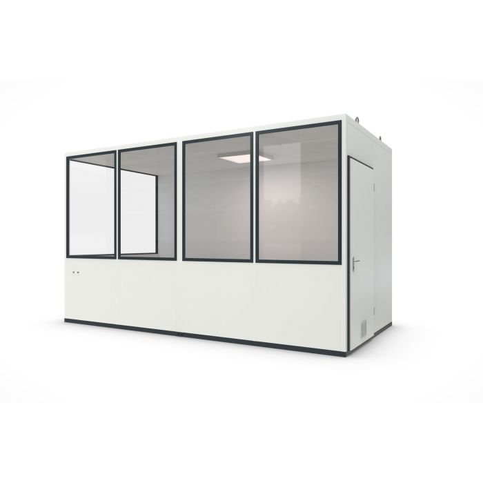 Dieses Hallenbüro / Meisterbüro eignet sich optimal als Einstiegsmodell für Unternehmen, die zusätzliche Aufenthaltsräume oder Hallenbüros im Innenbereich schaffen möchten. Dank seiner standardisierten Bauweise und reduzierten Gestaltungsmöglichkeiten ist diese Version kostengünstig und schnell lieferbar, besonders wenn es eilt. Die robuste Stahlkonstruktion ermöglicht es zudem, das System dank Kranösen nachträglich zu versetzen, wodurch Sie sich nicht auf dauerhafte bauliche Veränderungen festlegen müssen. Zwei Elektropakete stehen zur Auswahl, um Licht, Strom und Klimatisierung sicherzustellen.