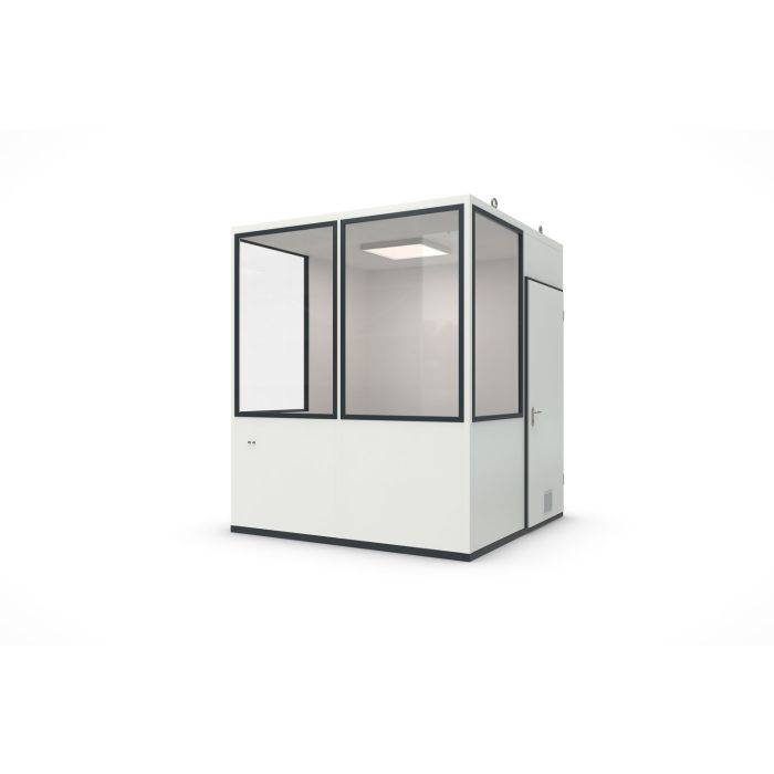 Dieses Hallenbüro / Meisterbüro eignet sich optimal als Einstiegsmodell für Unternehmen, die zusätzliche Aufenthaltsräume oder Hallenbüros im Innenbereich schaffen möchten. Dank seiner standardisierten Bauweise und reduzierten Gestaltungsmöglichkeiten ist diese Version kostengünstig und schnell lieferbar, besonders wenn es eilt. Die robuste Stahlkonstruktion ermöglicht es zudem, das System dank Kranösen nachträglich zu versetzen, wodurch Sie sich nicht auf dauerhafte bauliche Veränderungen festlegen müssen. Zwei Elektropakete stehen zur Auswahl, um Licht, Strom und Klimatisierung sicherzustellen.