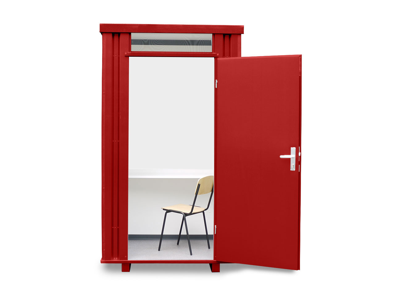 Kassenhäuschen, H2425 x B1400 x T1250 mm, 1 Fenster (Pos. C), inkl. Schreibtischablage und Stahlrohrstuhl, Aussenwandlackierung RAL 3000 feuerrot