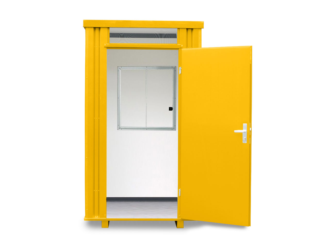 Das Kassenhäuschen mit bis zu 3 Schiebefenster (Verkaufsfenster) besteht aus doppelwandigem, verzinktem oder zusätzlich lackiertem Trapezblech und ist dadurch besonders stabil und wetterfest. Es wird häufig als Kassenraum, Pförtnerhäuschen oder Kontrollstation genutzt – zum Beispiel von Fußball- oder Sportvereinen als Kartenverkaufsstelle. Mit einer Grundfläche von knapp 2 m² ist die kompakte Box ideal für beengte Einfahrtsbereiche, etwa auf Parkplätzen oder als Ticketschalter. Das Fenster ist ein praktisches Aluminium-Schiebefenster und lässt sich bei Bedarf mit einem Klappladen sicher verschließen. Dieses Verkaufshäuschen ist in allen RAL-Standardfarben erhältlich und passt sich so dem Corporate Design von Vereinen oder Firmen perfekt an.