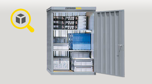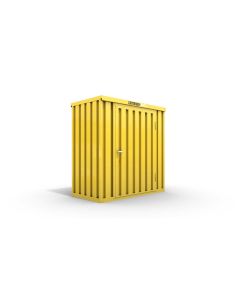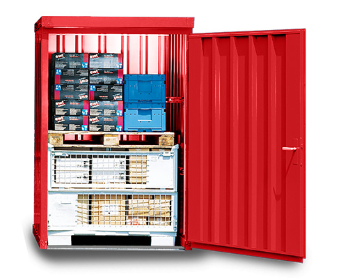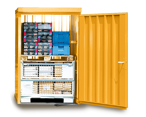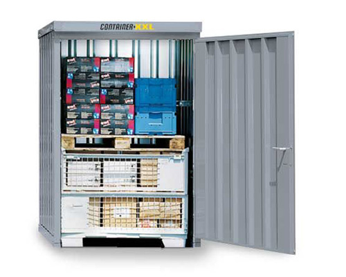 Materialcontainer mit Einflügeltür – 1 qm, H2195 x B1420 x T1490 mm, verzinkt, mit Holzfußboden, 1270 mm Einflügeltür mittig in Breitseite, Erfolgt fertig montiert