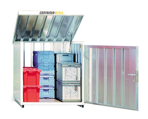 Materialcontainer mit Einflügeltür – 1 qm, H1470 x B1420 x T1490 mm, verzinkt, mit Holzfußboden, 1270 mm Einflügeltür mittig in Breitseite, Erfolgt fertig montiert
