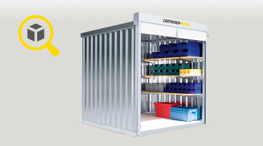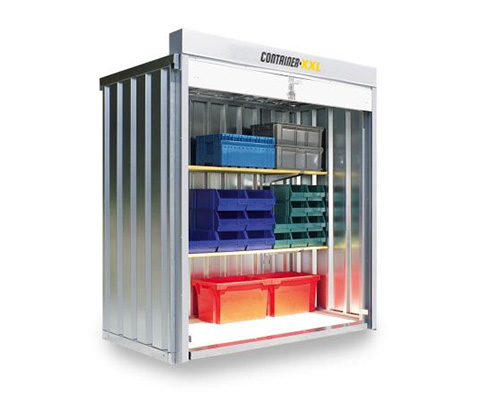 Materialcontainer S inkl. Lagerregal, 3 Ebenen á 1.000 mm – 2 qm, H2320 x B2100 x T1140 mm, verzinkt, mit Holzfußboden, 1830 mm Rollladentor mittig in Breitseite, Erfolgt fertig montiert