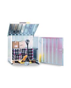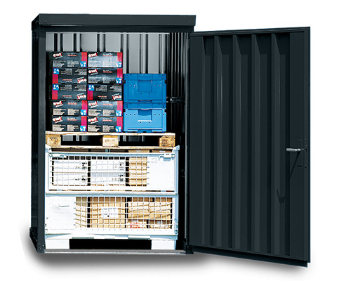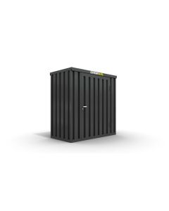 Materialcontainer mit Einflügeltür – 1 qm, H2195 x B1420 x T1490 mm, verzinkt, ohne Fußboden, 1270 mm Einflügeltür mittig in Breitseite, Erfolgt fertig montiert