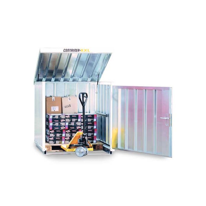 Materialcontainer mit Einflügeltür – 1 qm, H1470 x B1420 x T1490 mm, verzinkt, ohne Fußboden, 1270 mm Einflügeltür mittig in Breitseite, Erfolgt fertig montiert